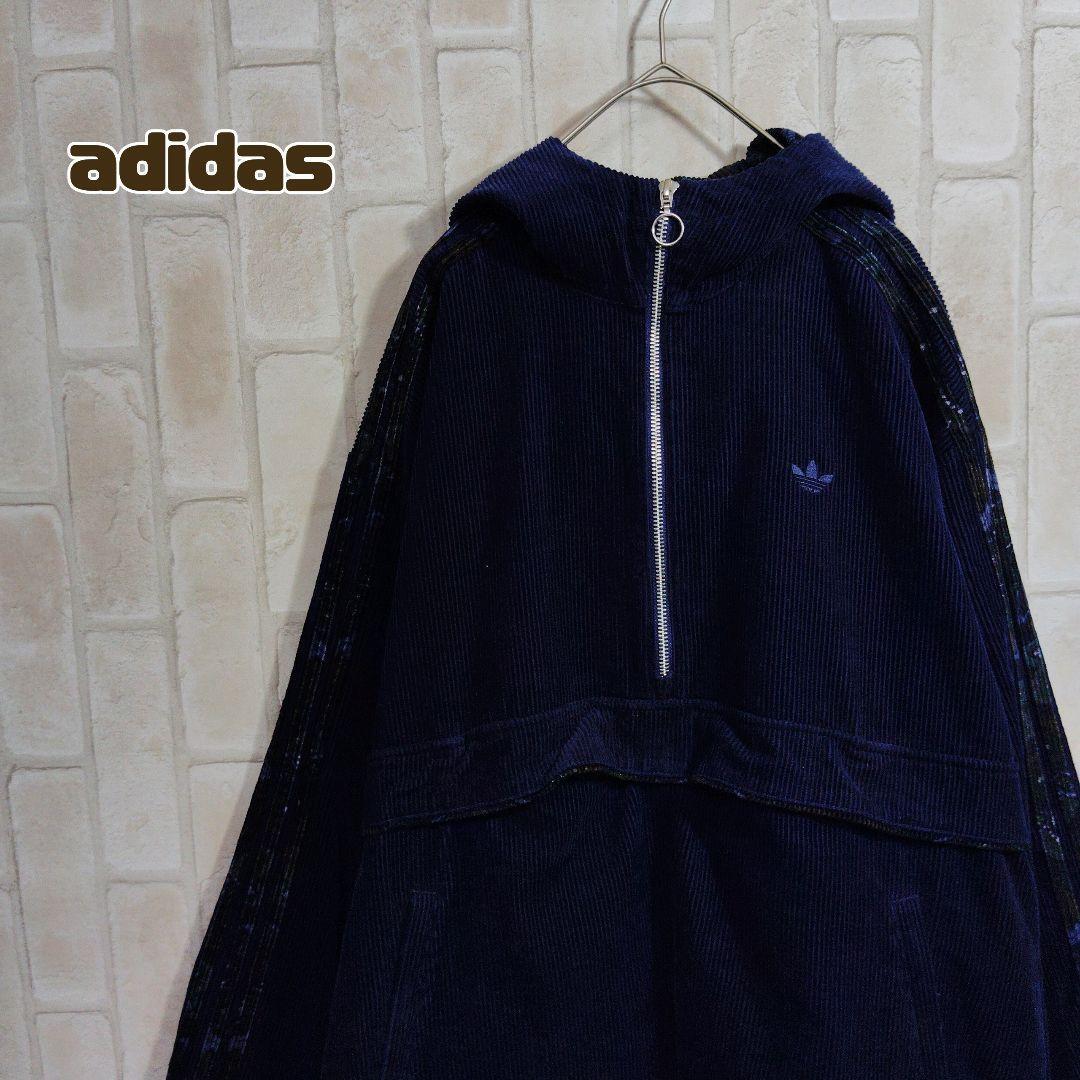 - アディダス コーデュロイ ジャケット ハーフジップ ネイビー フード