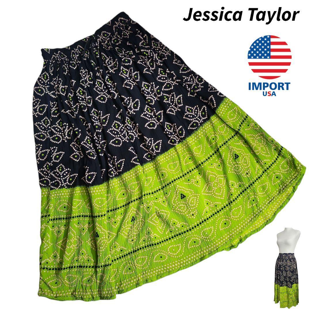 > エスニック総柄・楊柳っぽいレーヨン素材・ロング丈スカート ボヘミアン 黒 ライトベージュ 黄緑 ネイティブ柄Jessica Taylorアメリカ古着