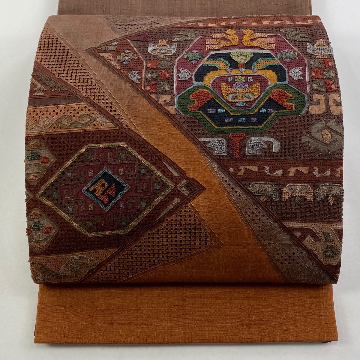 - 【美品】 袋帯 秀品 紬地 幾何学 相良刺繍 汕頭刺繍 茶色 お太鼓柄 正絹 【中古】