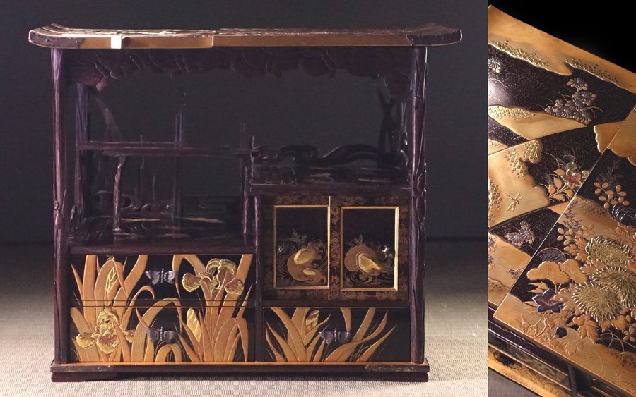 - ∇花∇最高峰の蒔絵芸術 江戸時代後期 燕子花に菊花蝶尽蒔絵鼻紙台 銀地蝶亀金具など超一級の作域 大名姫君の奥道具 美術館級!