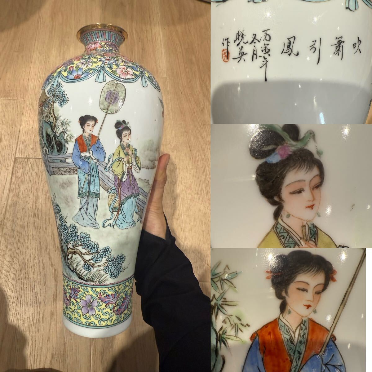 - 丙寅年新粉彩人物 花瓶 粉彩 置物 陶磁器 磁器 花入 花器 時代物 梅瓶 英作 中国美術 美術品 古美術 唐物 本物保証