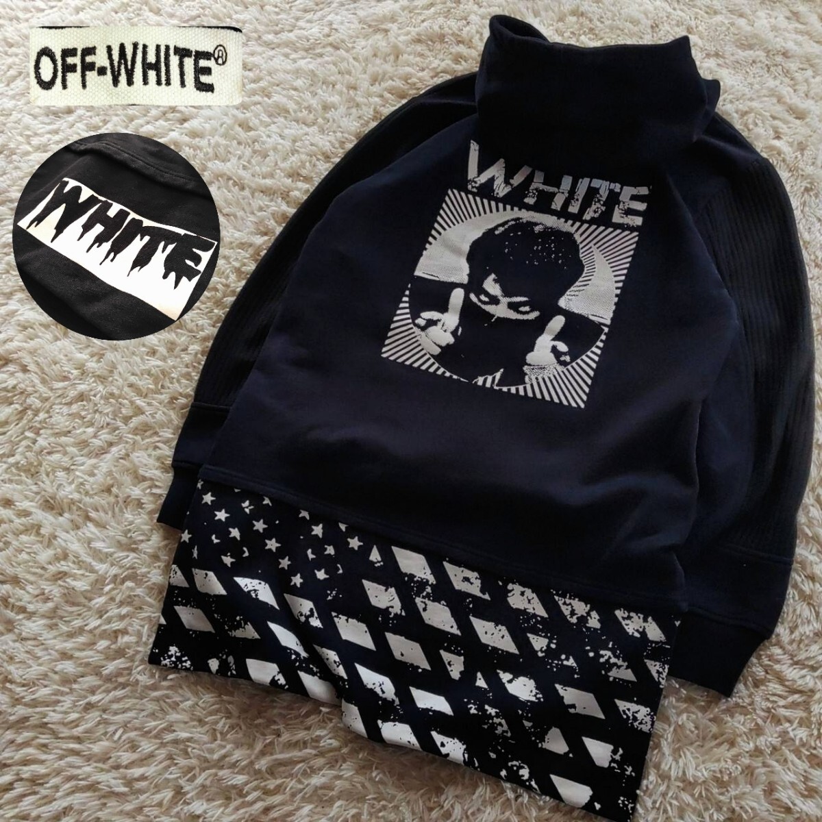 - OFF-WHITE オフホワイト 星条旗 ペイント 異素材 切替 肉厚 ロング丈 ジップアップ パーカー フーディオーバーサイズ フードコート Lサイズ