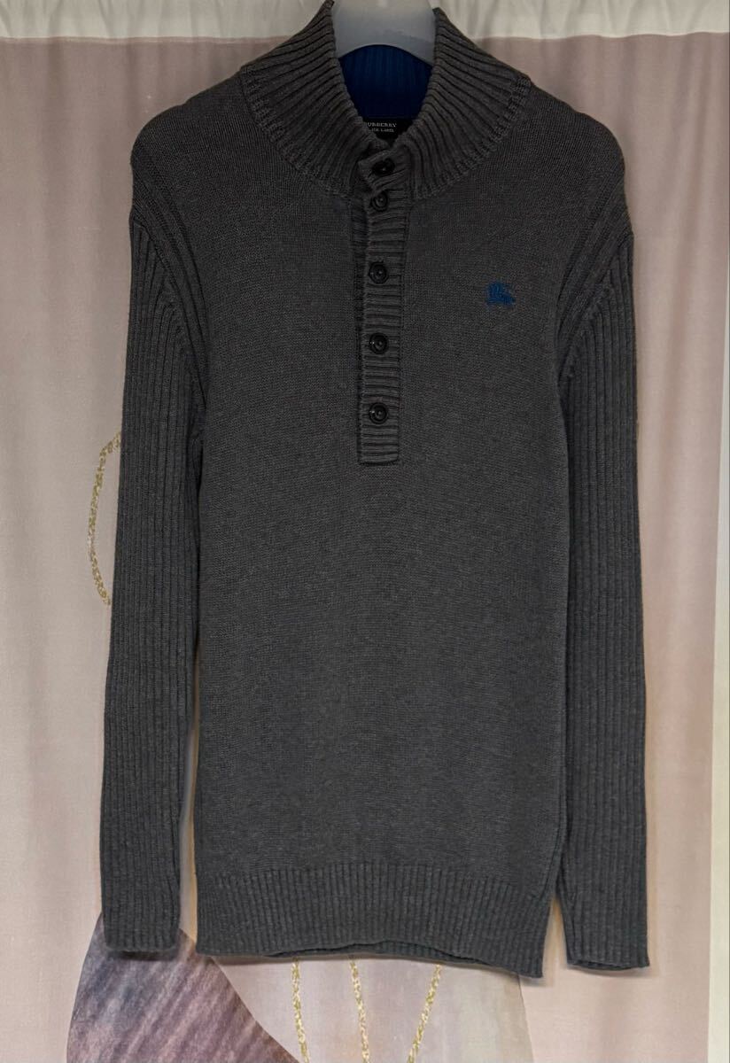- バーバリー ブラックレーベル ホースロゴ刺繍 ショールカラー リブニット グレー