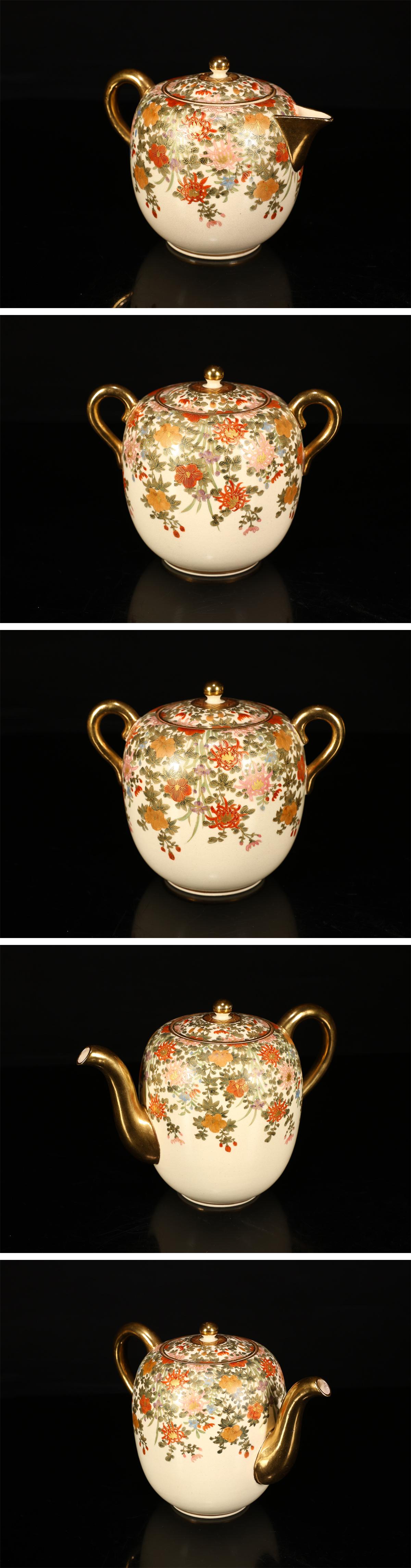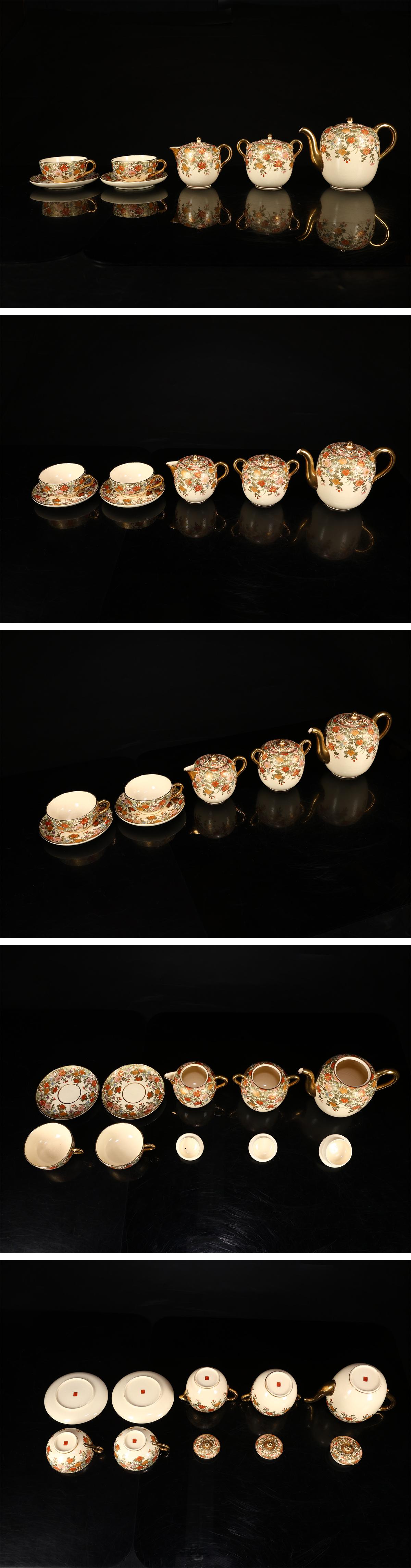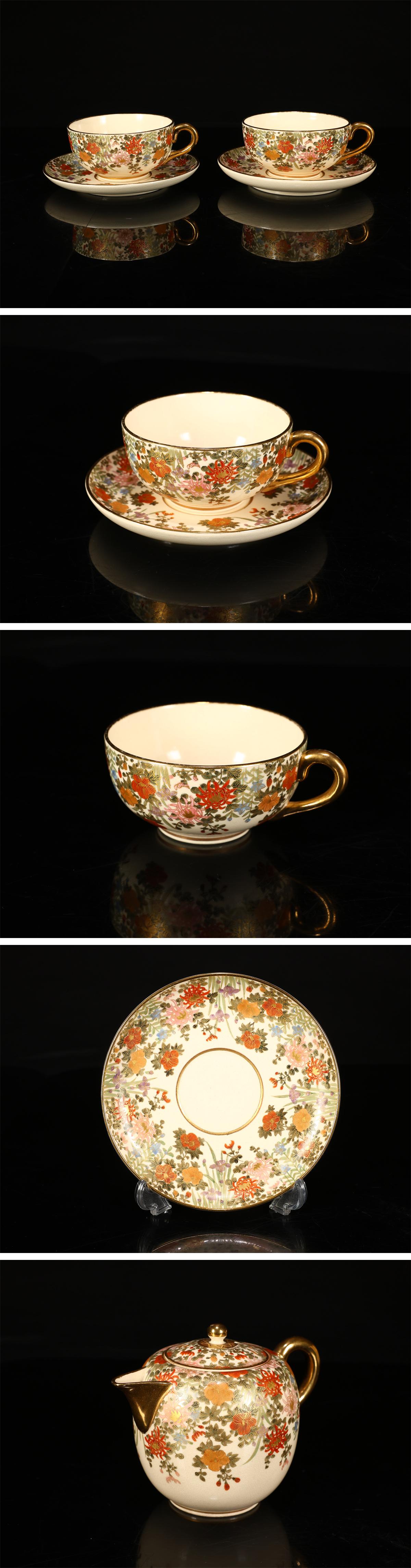 - 【吉】CL310 明治時代 清山作 【古薩摩焼】 金彩百花紋 カップ&ソーサー ティーポット シュガーポット ミルクポット 7点セット 本物保証Z