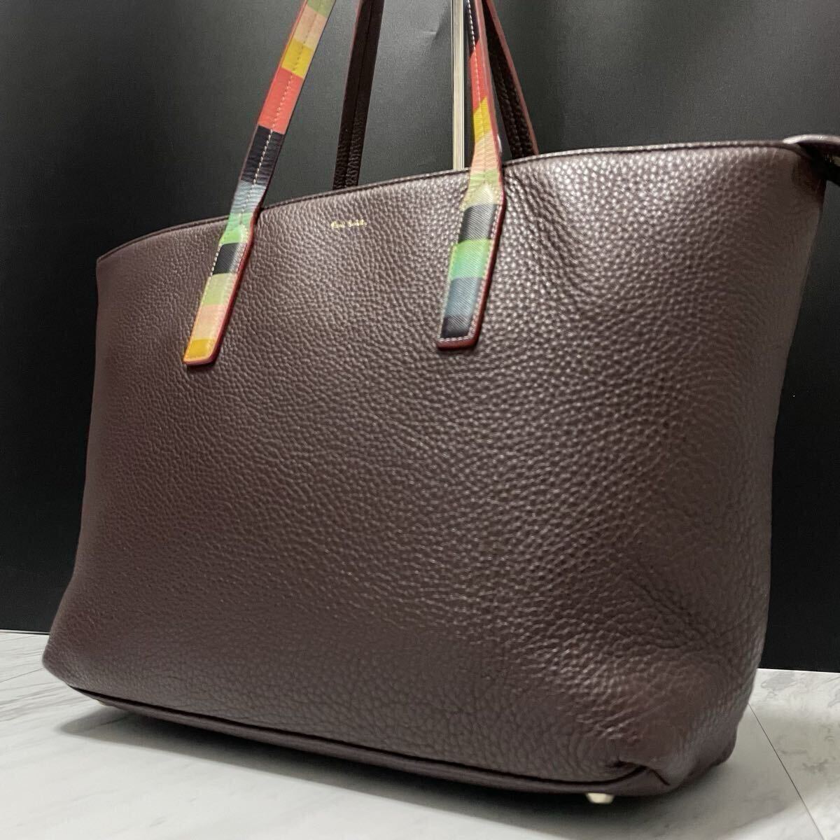 - 美品/A4●ポールスミス Paul Smith トートバッグ マルチストライプ ロゴ オールレザー シボ革 肩掛け 3層 茶 ブラウン メンズ ビジネス
