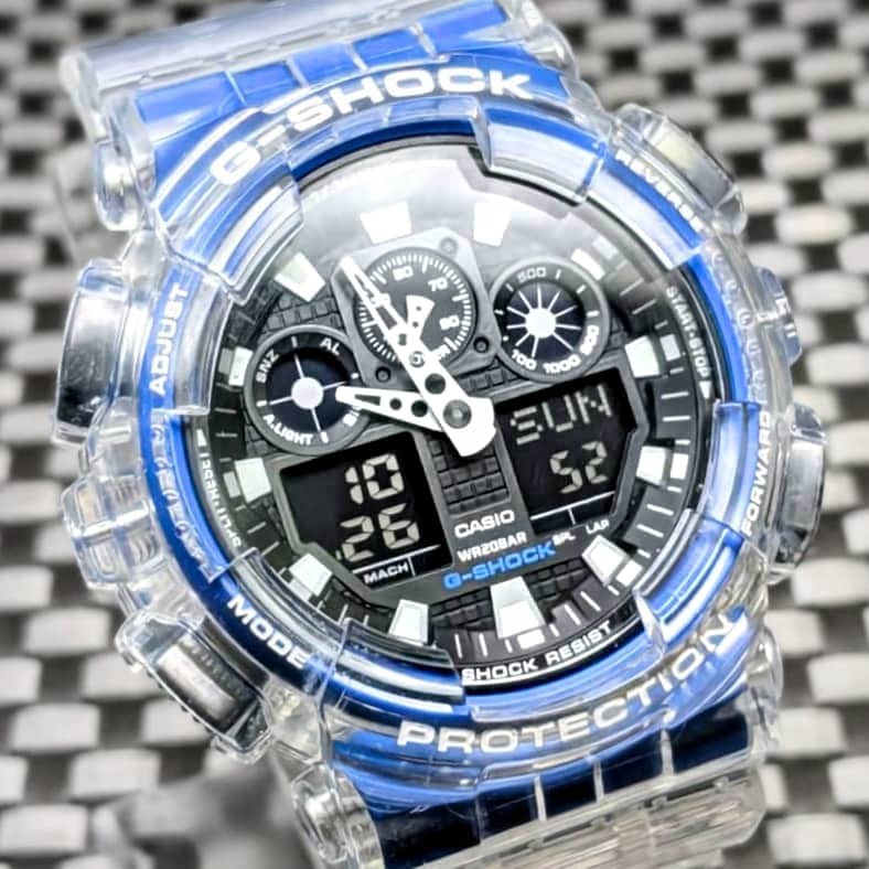 - G-SHOCK GA-100B クリアスケルトン ベゼル・ベルト アナデジ ブルー (ロゴ ホワイト) + メタル遊環 [電池新品] - 送料: 230円~