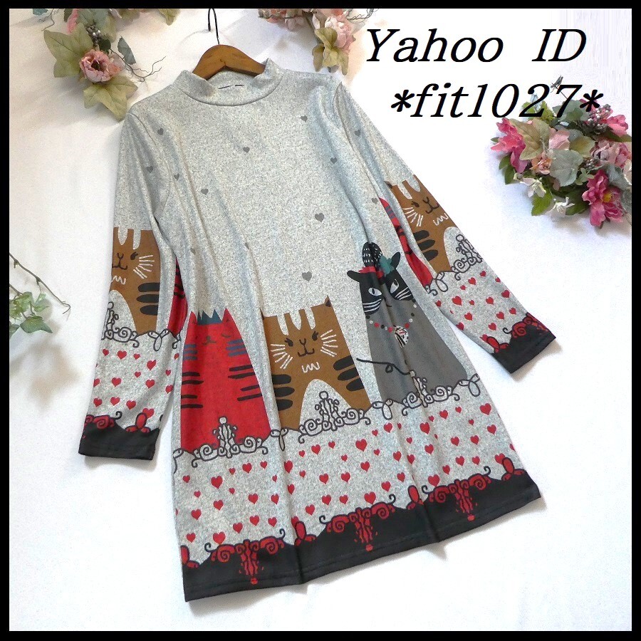 - ゆったりサイズ【新品】柔らかなニットソー素材♪チャーミングなネコ&ハート柄のプリント★ハイネックチュニック◇グレー◆fit1027◆
