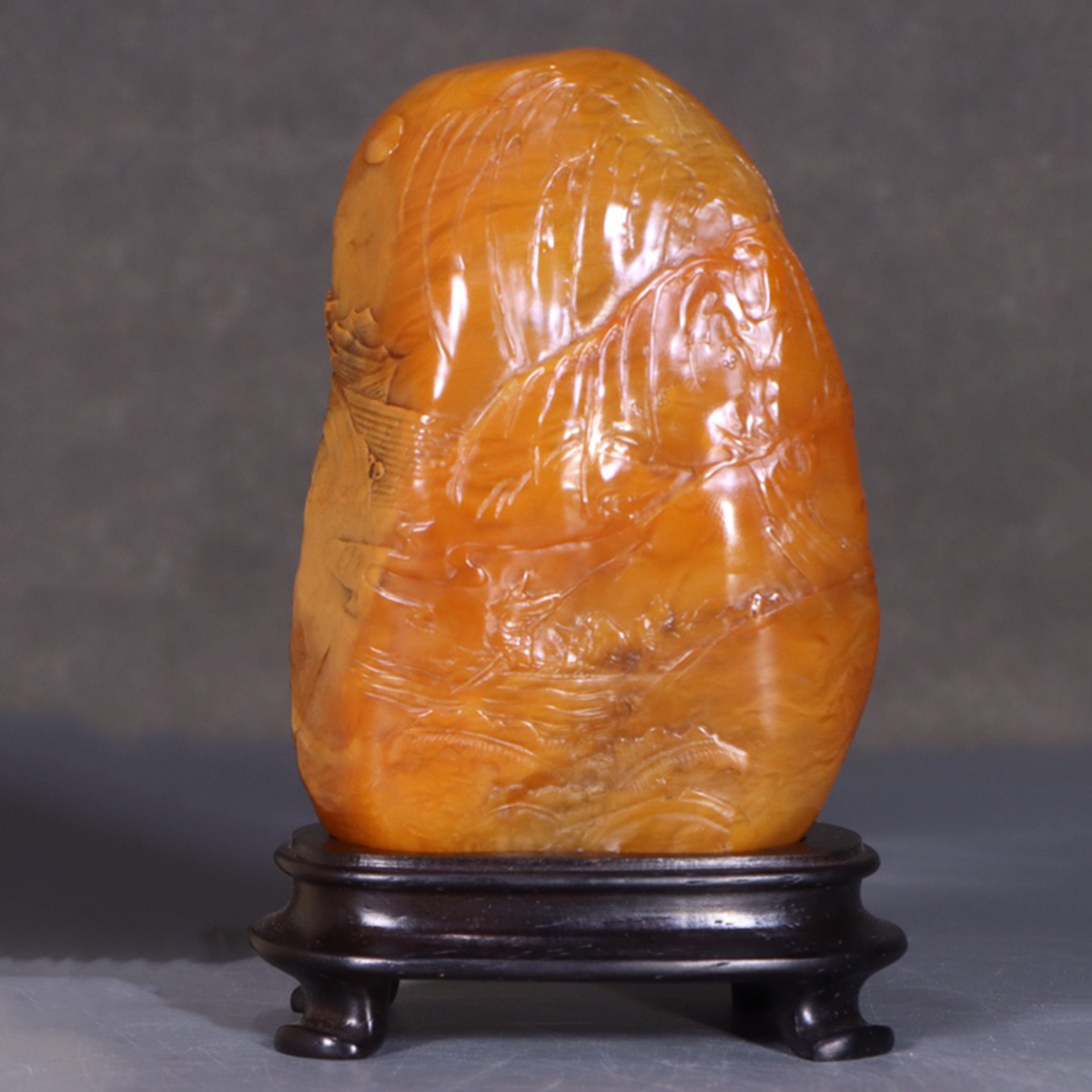 - ▽鴻▽清時代 寿山田黄石彫 人物故事紋山型置物 台座付き 共箱 時代物 中国古美術 骨董品