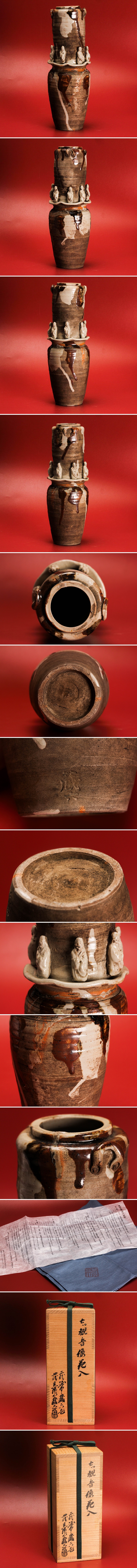 - 二代 真清水蔵六 七つ観音像花入 四代 真清水蔵六識箱 共布 栞 本物保証