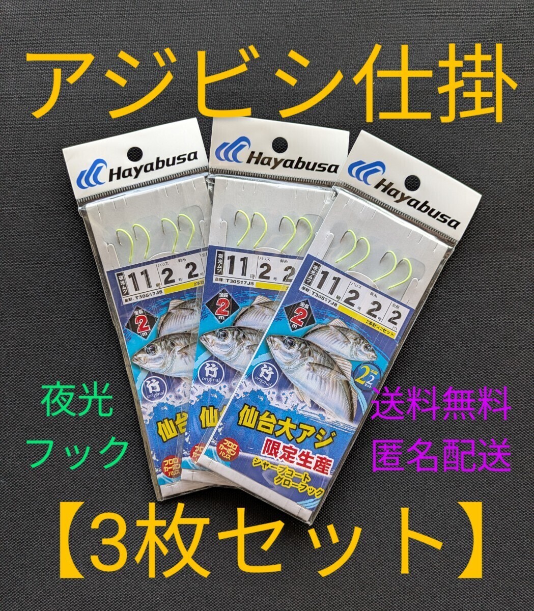 > 鯵ビシ仕掛2本針×2組入【3枚セット】アジビシ 仙台大アジ 夜光ムツ鈎11号 ハヤブサ 送料無料 匿名配送 フィッシングカンパニー
