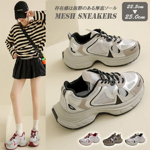 > レディース メッシュスニーカー 紐靴 シューズ ボリュームソール 厚底 美脚 23.5cm(37) ブラウン