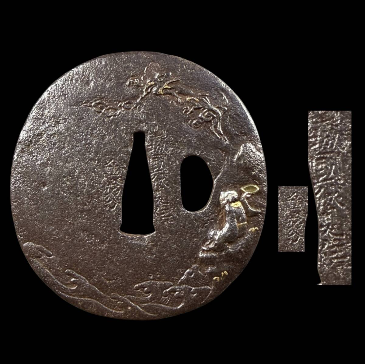 - 【偲】江戸時代 在銘 鉄地鐔 金象嵌 銀象嵌 鍔 つば 居合用 日本刀装具 直径約7.2cm 重さ約121.2g r-1030