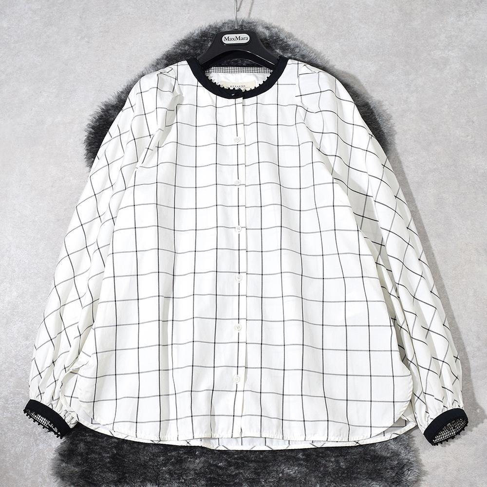 - 2018AW マックスマーラ Weekend Max Mara ビーズ装飾 格子 チェック パフスリーブ ブラウス 36 S 白 前開き ボックスプリーツ