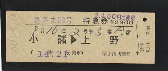- ◆硬券切符◆特急券 あさま58号 小諸→上野