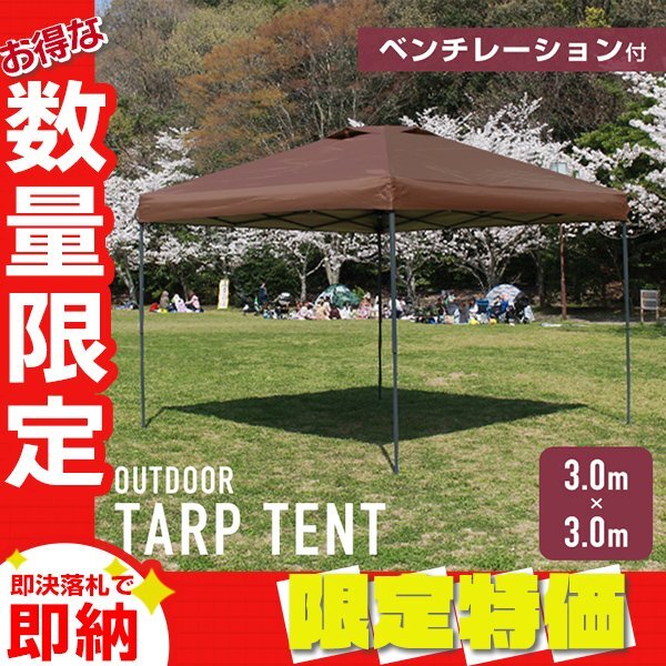 > 【限定セール】タープテント 3m ベンチレーション 撥水加工 収納ケース 軽量 スチールフレーム 日除け アウトドア キャンプ BBQ ブラウン