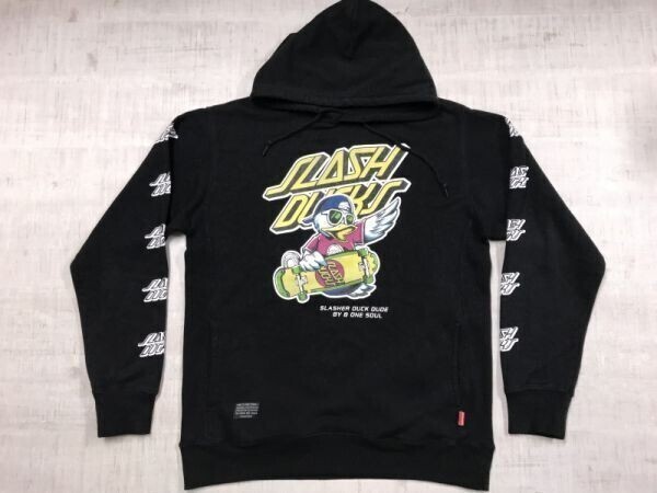 - B ONE SOUL ビーワンソウル DUCK DUDE ダックデュード 袖プリント ストリート SLASH DUCKS スウェットパーカー プルオーバー メンズ L 黒