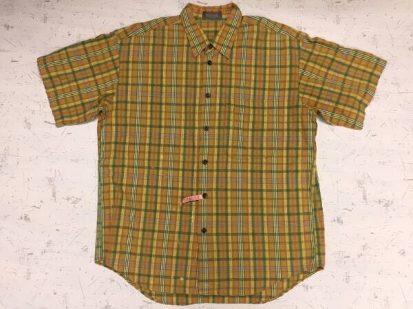 - インターメッツォ INTERMEZZO レトロ チェック総柄 凹凸 半袖シャツ メンズ コットン100%クリーニング済 L 黄色系