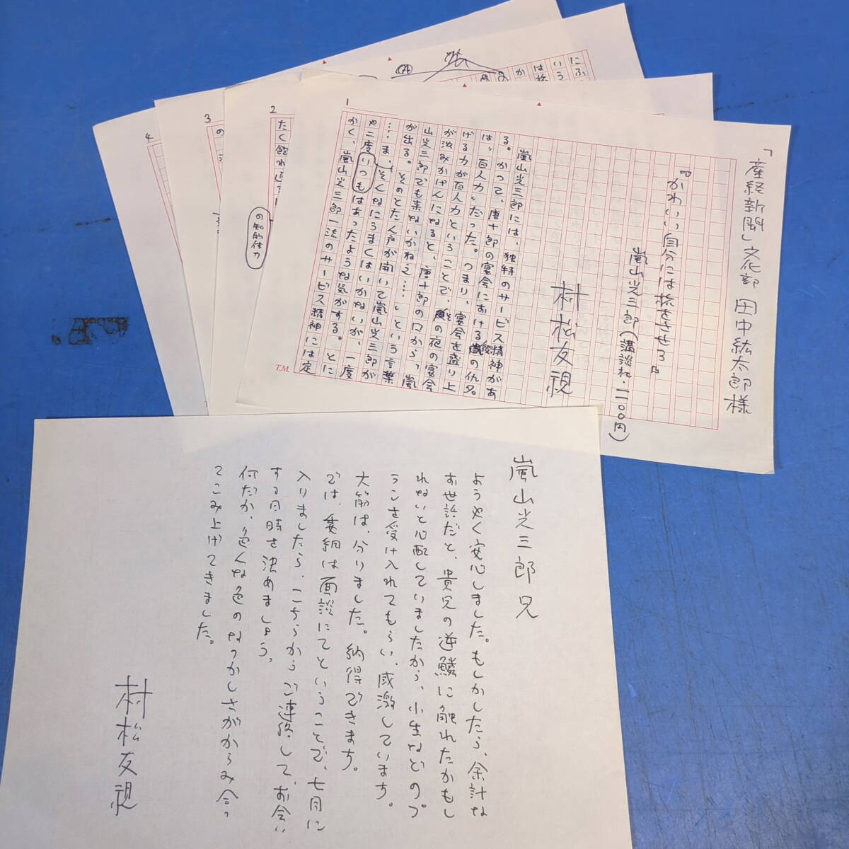 - 村松友視肉筆原稿4枚完『かわいい自分には旅をさせろ 嵐山光三郎』『嵐山光三郎あて書簡1枚』産経新聞《真作》kankando
