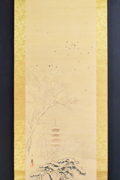 - K6476 真作 長井一禾「雪中五重塔図」絹本 合箱 肉筆 浮世絵師 河鍋暁斎門人 鴉 冬 日本画 中国 絵画 掛け軸 掛軸 茶掛 古美術 新潟の人