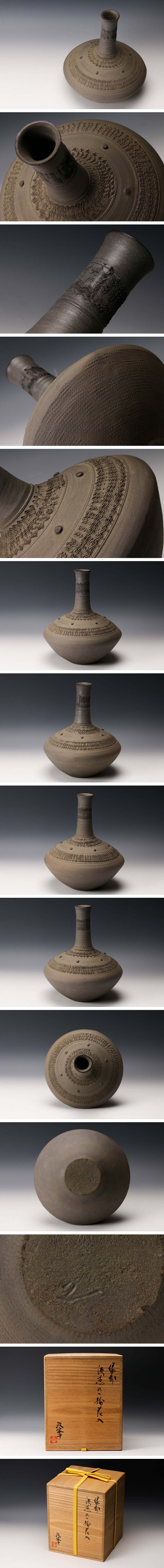 【佳香】各見政峯 高さ25cm 備前須恵一輪花入 共箱 本物保証