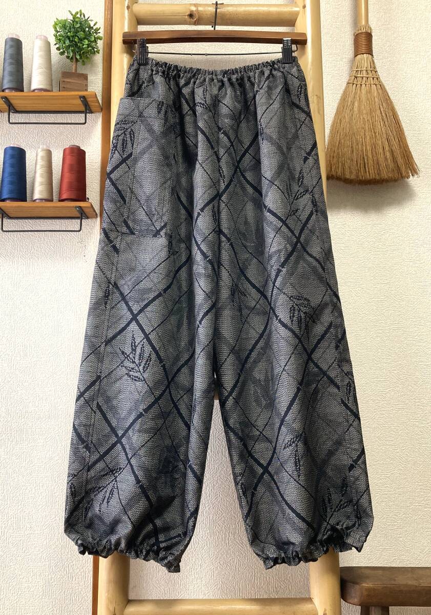 - 鎌倉まるか堂 着物リメイク 紬 黒銀の竹笹格子もんぺ風 ●絹 ●ゆったりまるっこいシルエット L~LL●裾ふわパンツ●洗濯OK