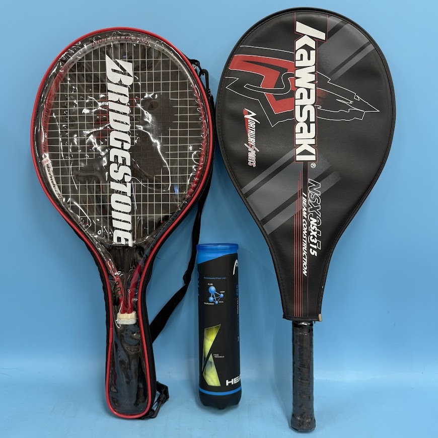 > 【A1055-10】 テニスラケット Kawasaki [ NSX315 ]& BRIDGESTONE [ TS-025 ](カバー付き) + HEAD PRO ボール (ケース付き)×4個 6点セット