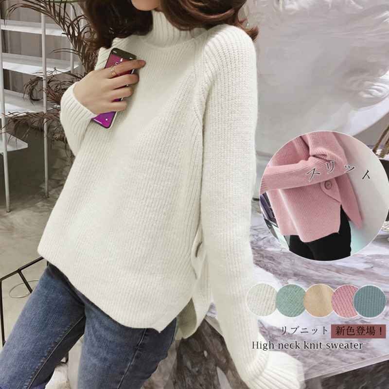 - リブニット トップス ハイネック ニット セーター レディース 秋冬 スリット フリー ベージュ