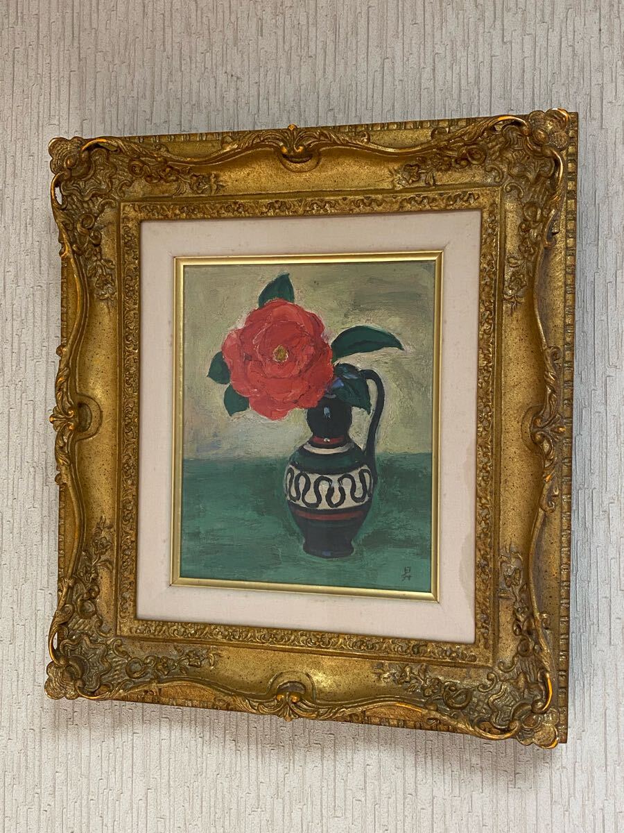 - 長谷川昇 油彩画「八重椿」3号 日本芸術院会員 日展理事 絵画/美術品/真作/額縁/静物画