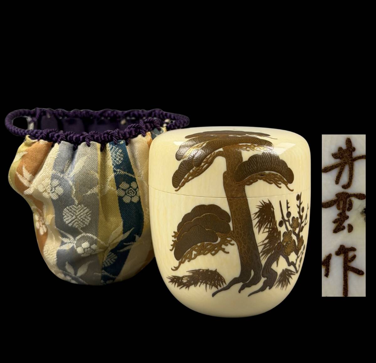 > 【偲】芳雲作 鯨歯風 天然素材 茶棗 棗 茶入 茶器 細密彫刻 東洋彫刻 天然材質 彫刻 高さ約7.5㌢ 重約144.46g r-1072