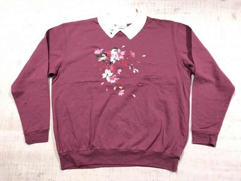 > MORNING SUN モーニングサン オールド アメカジ 90s US古着 ラメ花鳥プリント 襟付き スウェット トレーナー シャツ レディース XL 紫