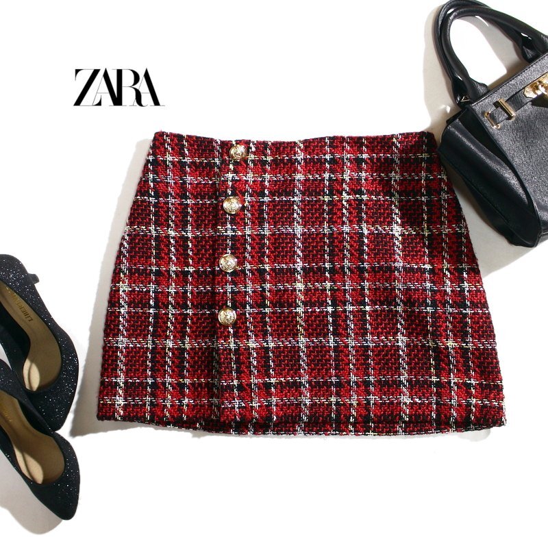 > 美品 ZARA ザラ チェック柄 ツイードミニスカート 立体 エンブレム 金ボタン レッド 赤 M ブラック 黒 ホワイト 白 スカート ツイード