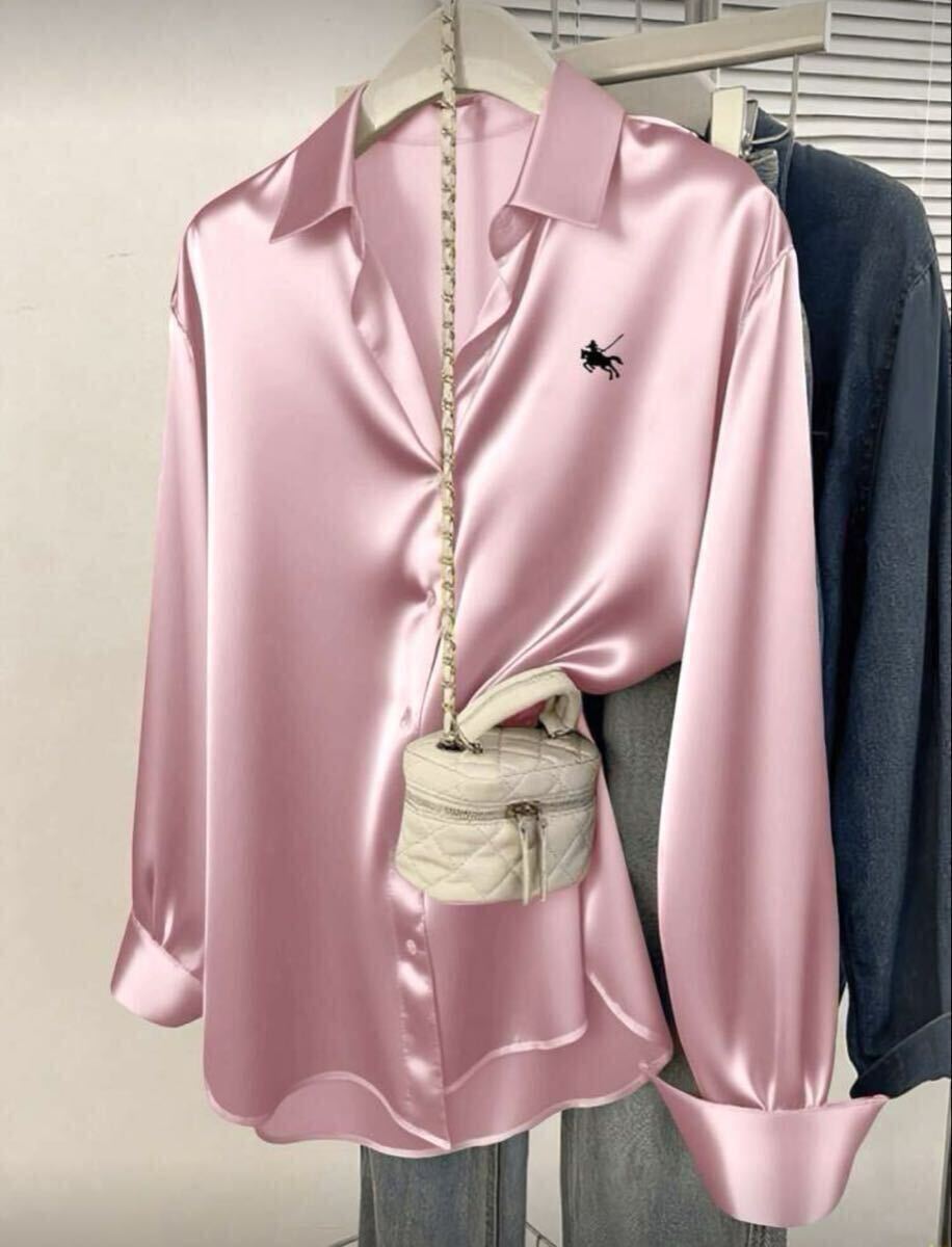 - 超光沢 サテンシャツ ブラウス ピンク 長袖 トップス OL オフィス 秘書 フェチ 女装家様