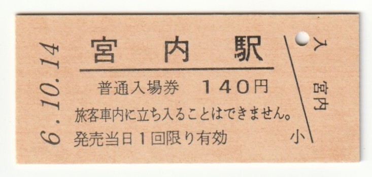 - 平成6年10月14日 信越本線 宮内駅 140円硬券普通入場券(日付印刷)