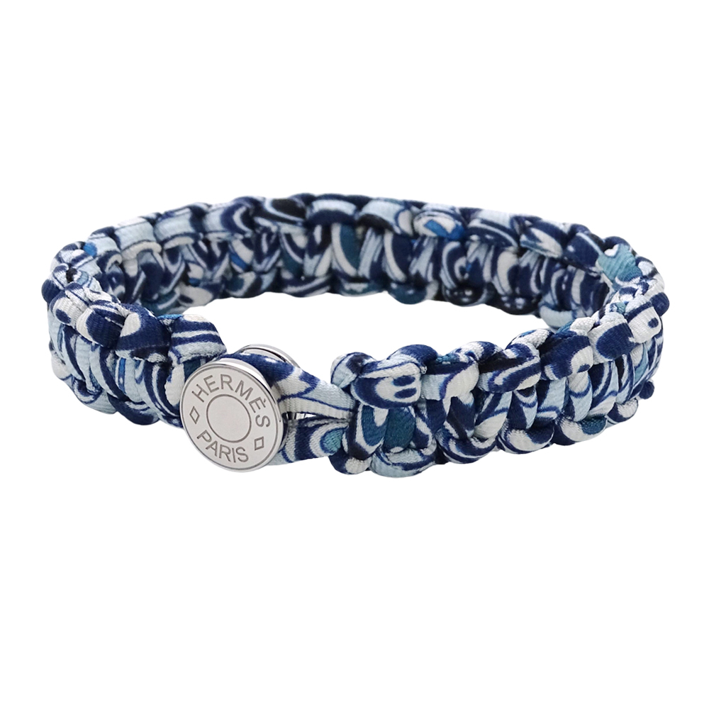 > エルメス HERMES ブレスレット レディース メンズ ブランド キッド セリエボタン シルク メタル ブルー シルバー 編み込み カジュアル