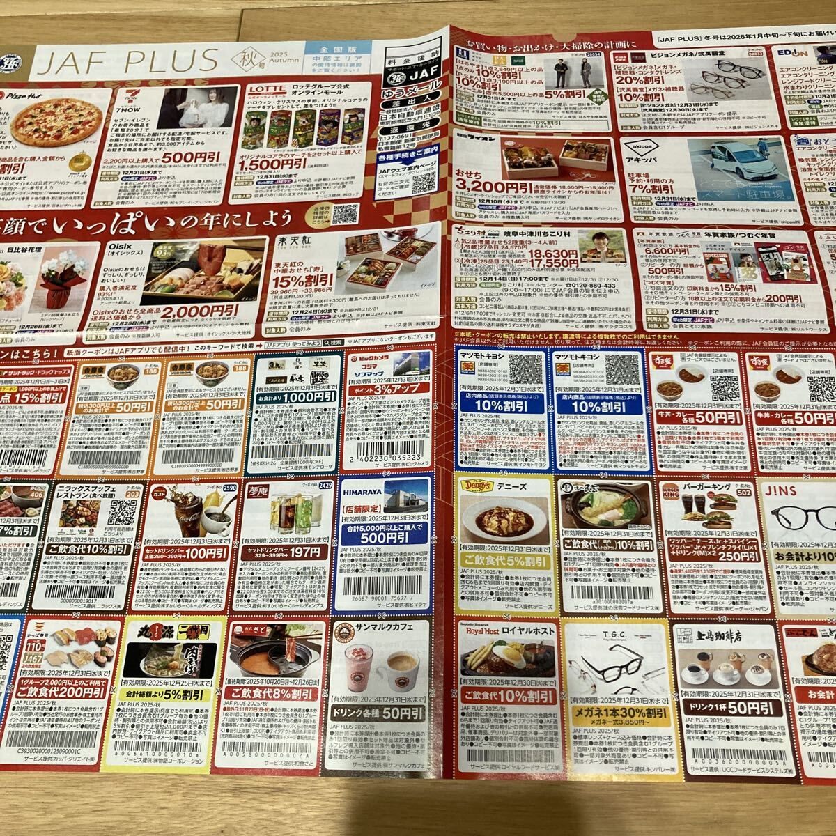 > 2025秋JAF クーポン JAF PLUS かっぱ寿司 サンマルクカフェ デニーズ ロイヤルホスト すき家 JINS 吉野家 ガスト 日本モンキーパーク