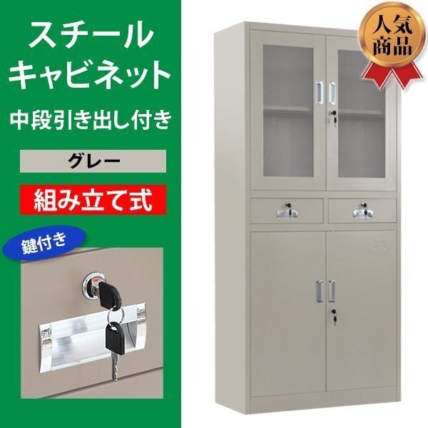 - 送料無料 ロッカー おしゃれ スチールキャビネット 書庫 開き戸 引き出し アクリル窓仕様 鍵付き スペアキー付き 可動棚付き グレー