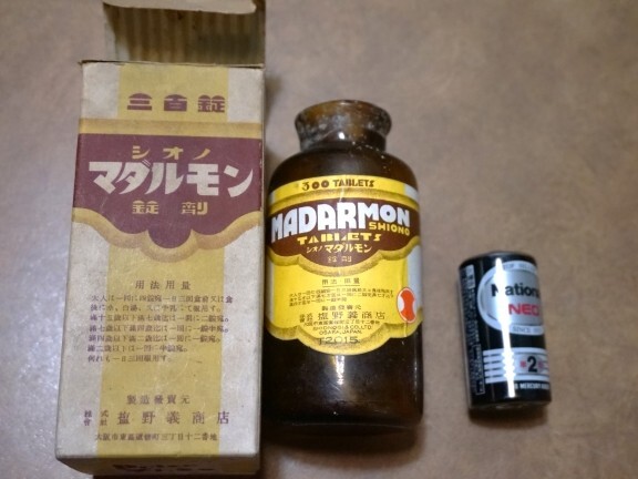 - 昭和初期 ガラス瓶 空瓶 薬瓶 マダルモン ラベル付瓶 外箱 アンバー ビンテージ 昭和レトロ ボトル 時代 当時物