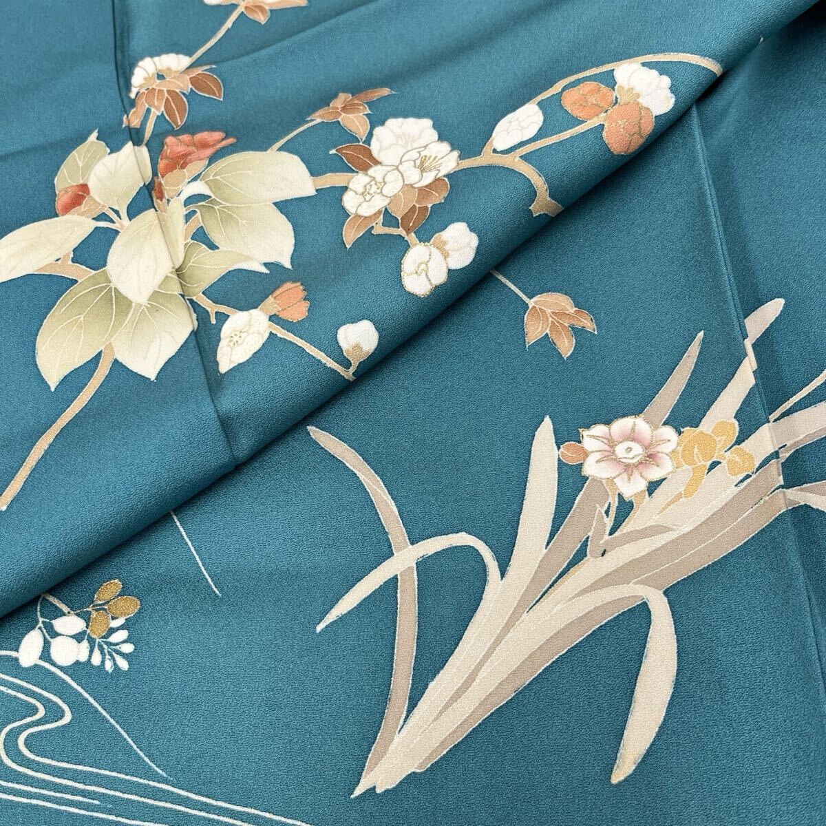 - 付下げ ターコイズブルー 上品な花模様の染め 着物 正絹 F-900