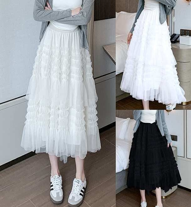 - ひざ丈スカート チュール フリルスカート きれいめ シンプル カジュアル かわいい ボトムス フリー ベージュ