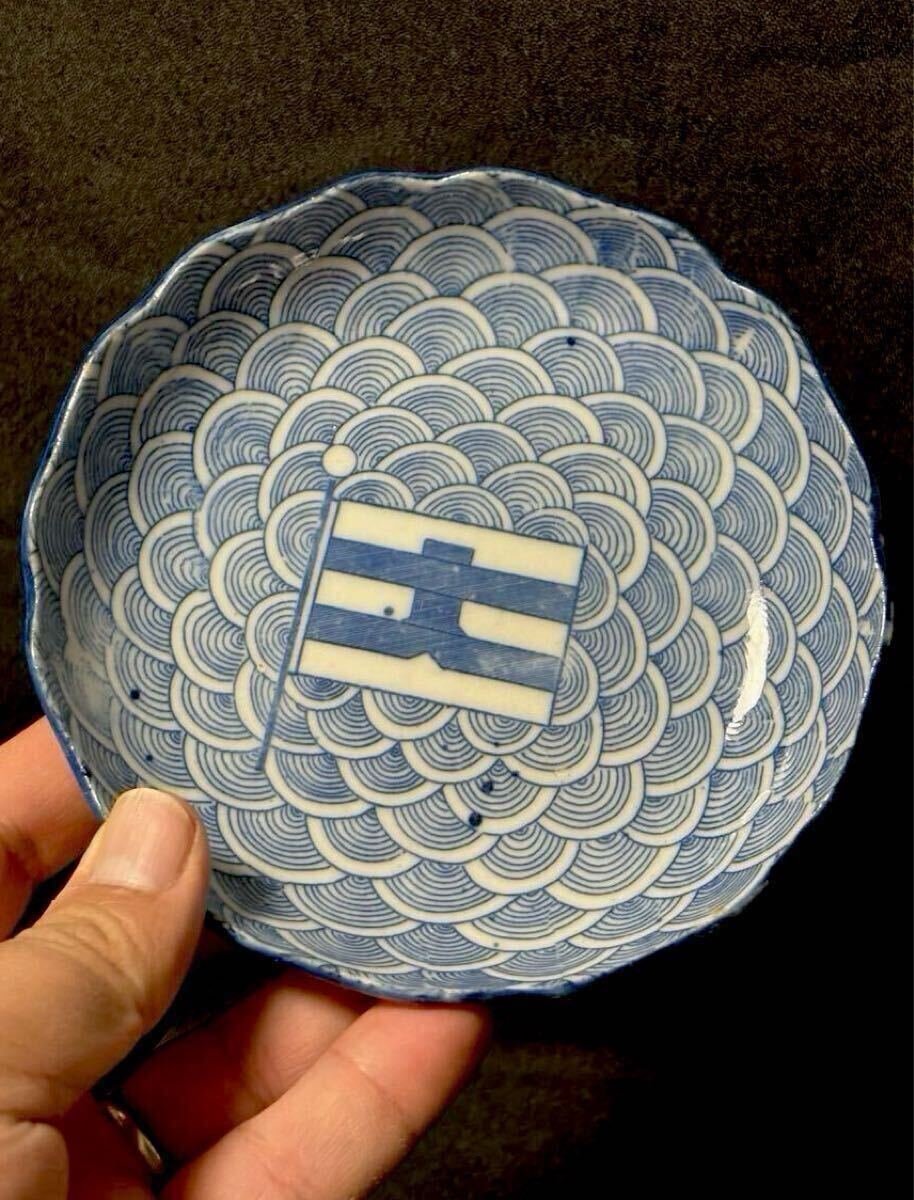 - 大海にたなびく旗印!珍品図変わり印判 明治期 瀬戸焼 青海波に大阪商船の旗!使いやすいサイズのなます皿 鉢 うれしい無疵完品です!