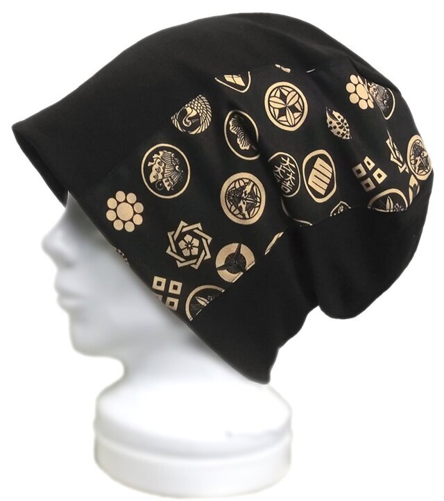 - ◇送料無料◇ ハンドメイド◆和柄[戦国武将/家紋柄]ルーズワッチキャップ◆コットンニット/黒 ◇ゆったり・小顔効果・オールシーズン着用