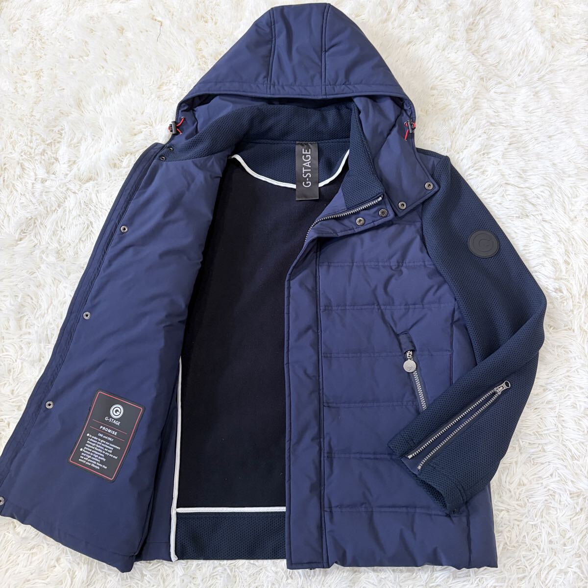 > 極美品/希少2XL ●G-STAGE ジーステージ 切替ダウンジャケット ゴルフ メッシュ 2way フード取外可 ダブルジップ ワッペン ネイビー メンズ