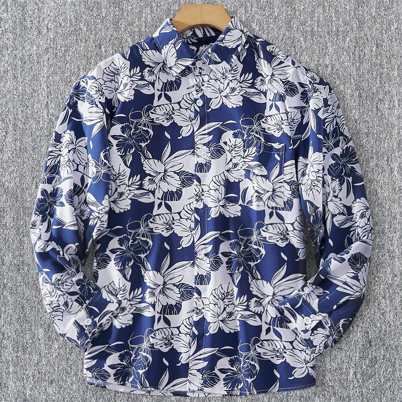 > 高品質感!新品 DCKMANY メンズ長袖シャツ レトロ ビーチの風 プリント柄 春夏 肌触りが良い カジュアル/ 紺色T4056-3XL