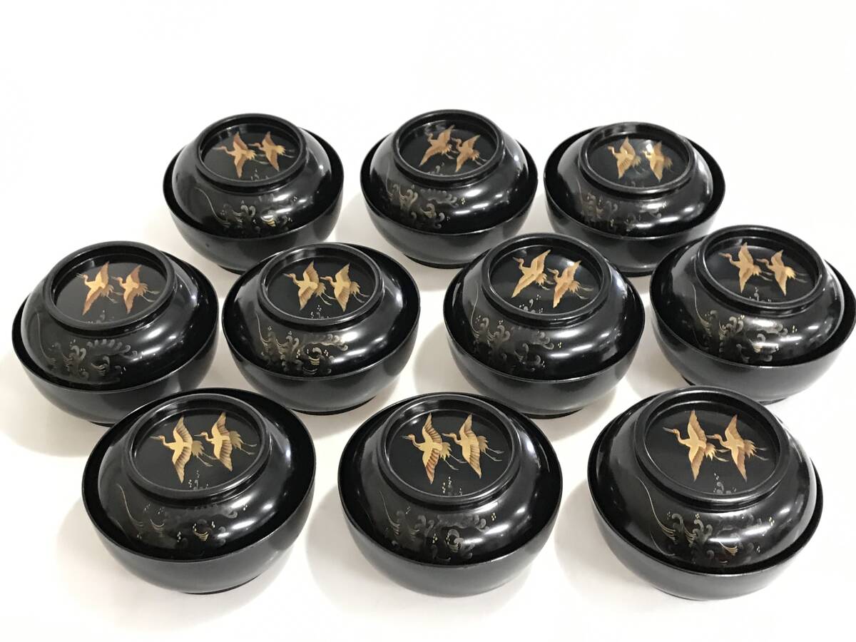 - HG8925 大正期 黒塗 菓子椀 十客揃 双鶴蒔絵入 時代物 吸物椀 見返椀 亀 お椀 汁椀 箱付 木製漆器 和食器 漆器 伝統工芸品