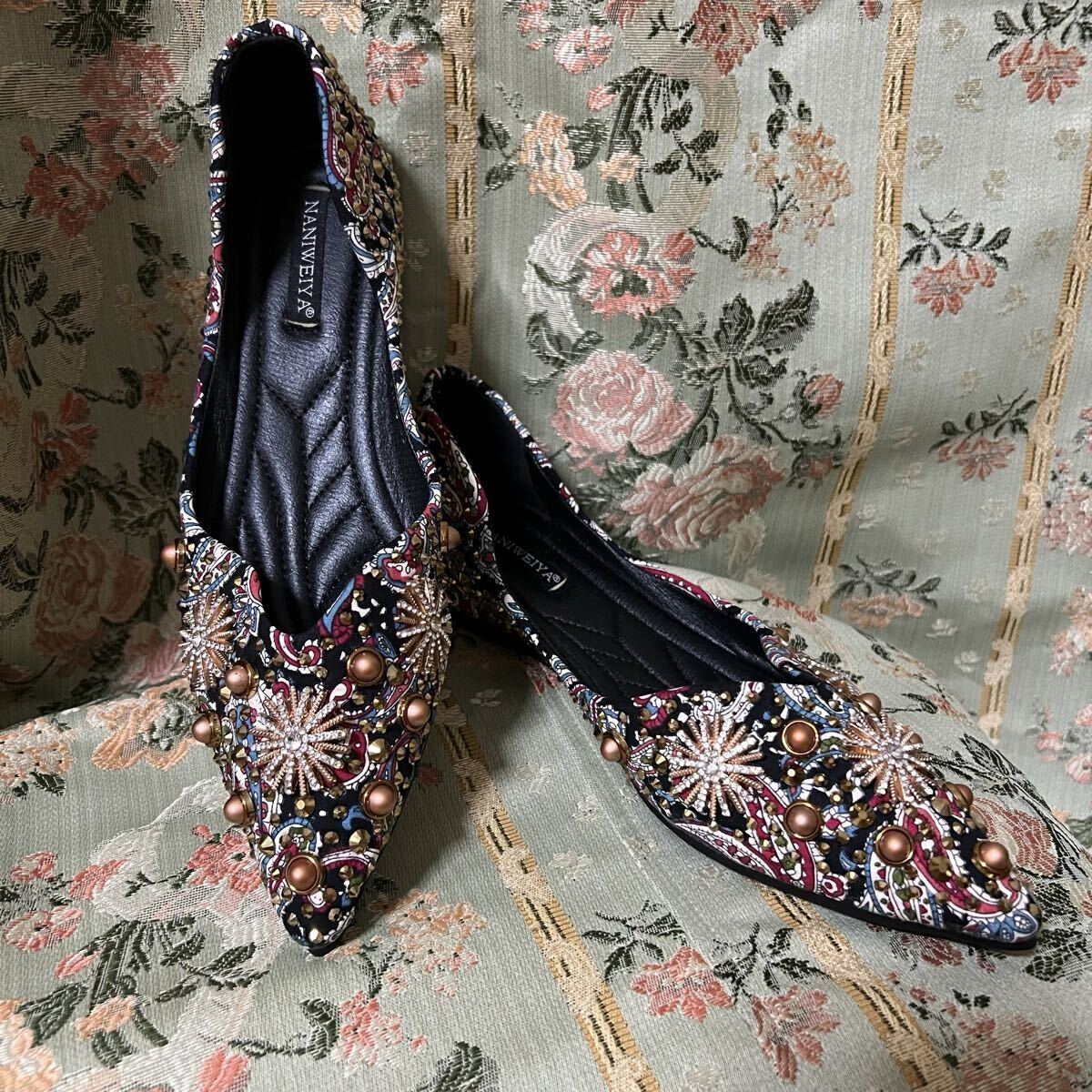 - 【未使用】NANIWEIYA 24cm ナニウェイヤ ビジューパンプス フラットシューズ 刺繍 ビーズ 高級 デザイナーズ 上品 エスニック調 ブラック系