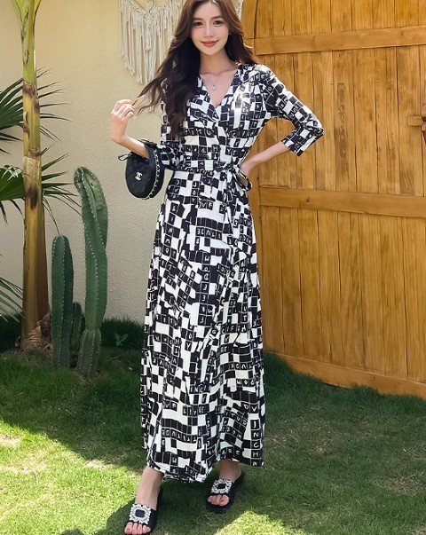 - ロングワンピース マキシ丈 七分袖 フレア Vネック アルファベット 英字ロゴ レディース L ブラック