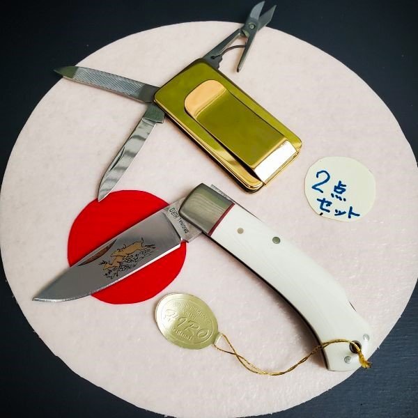 - 【アウトレット品】 HIRO オリジナル 他 折りたたみ式 アウトドアナイフ クリップ付ナイフ 2点セット KNIFE 釣り キャンプ sp-032-566
