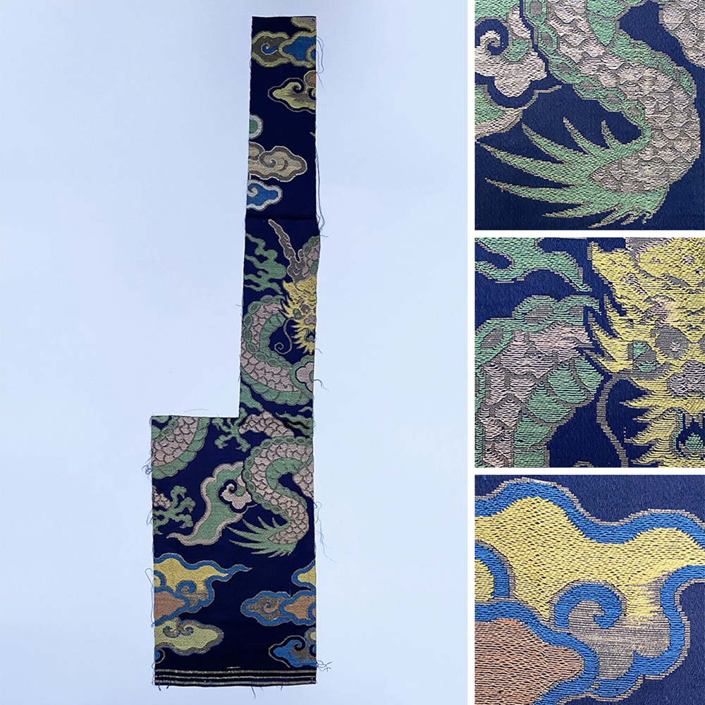 - 【日本美術】 ★ 織繍 藍地雲龍紋織錦片 ★ 江戸期 昇龍祥雲 綴織文様 和風織物 検中国清朝清代清時代古布古裂古美術古玩古董骨董唐物