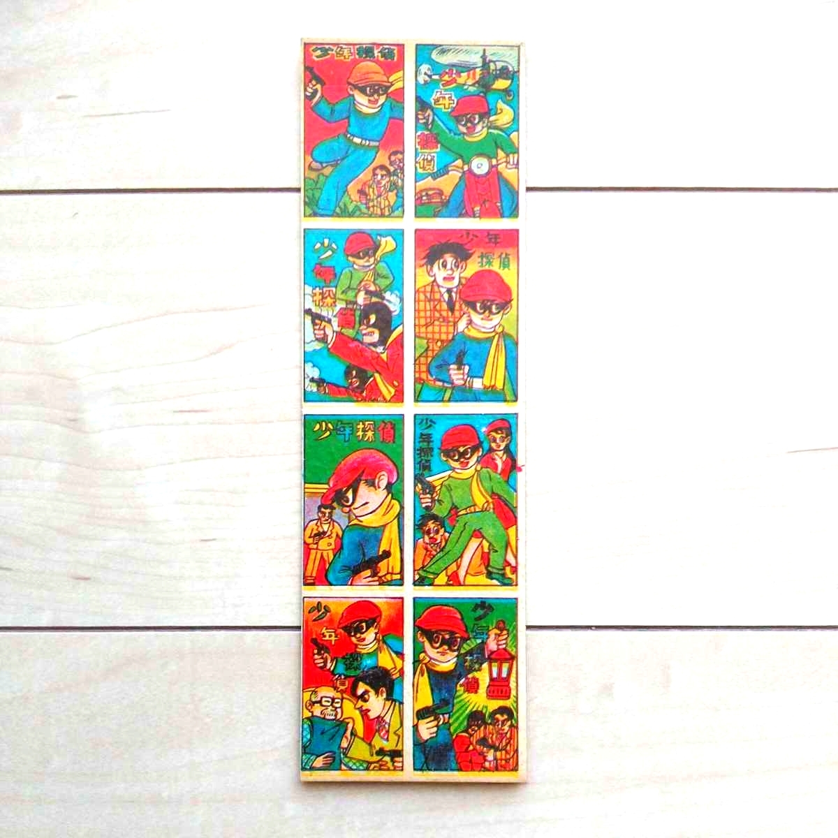 - ■『駄菓子屋疑似めんこ「少年探偵」(まぼろし探偵)』未裁断Sheet1枚。Sheetの縦25.5㎝/横8.8㎝/厚み1㎜。昭和30年代の懐かしのItem。