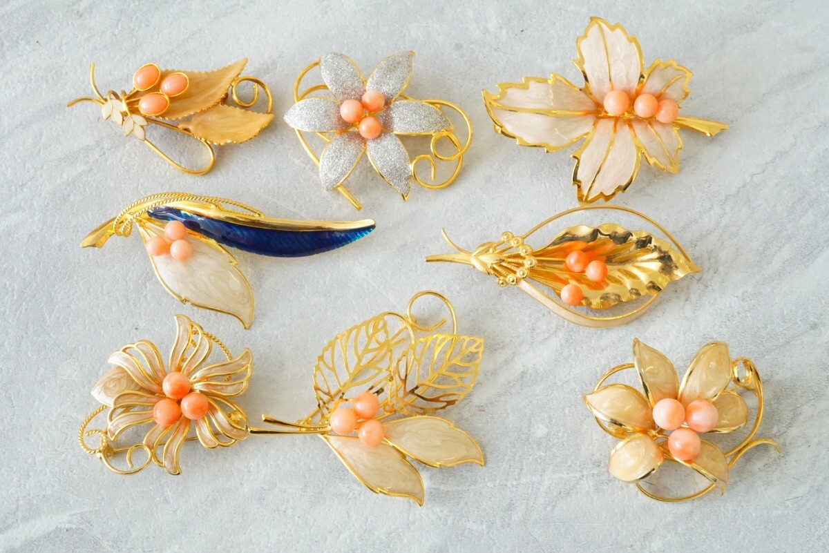 - B1148 本珊瑚 ゴールドカラー ブローチ 8点セット アクセサリー ヴィンテージ 大量 まとめて おまとめ まとめ売り コーラル サンゴ